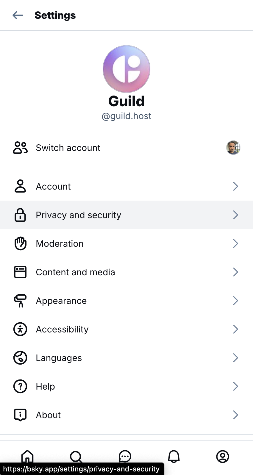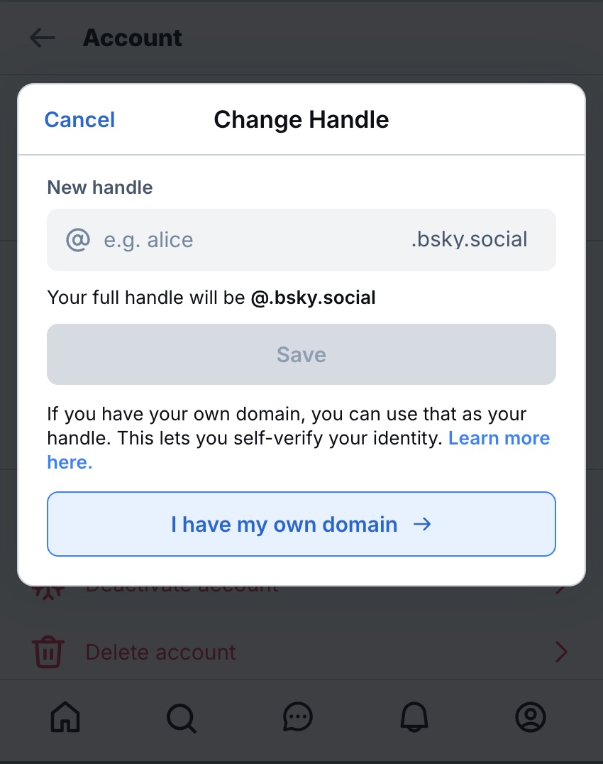 Or, manually go to Bluesky's Settings screen. Then select the"Account" tab